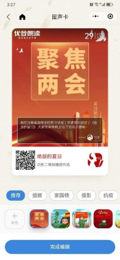 4. 朗讀完成后,點擊“完成”,點擊相冊添加喜歡的圖片或使用默認圖做封面,在“選擇活動”處確認提交至“奮進新征程·唱響新時代—第四屆河南省高校主題朗讀大賽”,點擊“發布”,即作品提交參賽成功。