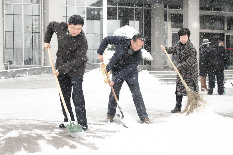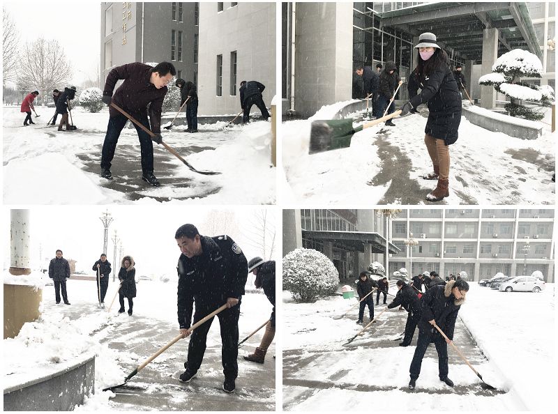 早上9點,在魏書記的帶領下,機關黨總支組織第一、第二支部的20余名黨員、職工不畏嚴寒,頂著風雪,揮舞著鐵鍬、笤帚開始對辦公樓前廣場、道路上的積雪進行清掃,大家齊心協力,配合默契,鏟的鏟、推的推、掃的掃,干得熱火朝天,不亦樂乎,忙碌的身影構成了冬日校園一道亮麗的風景線。