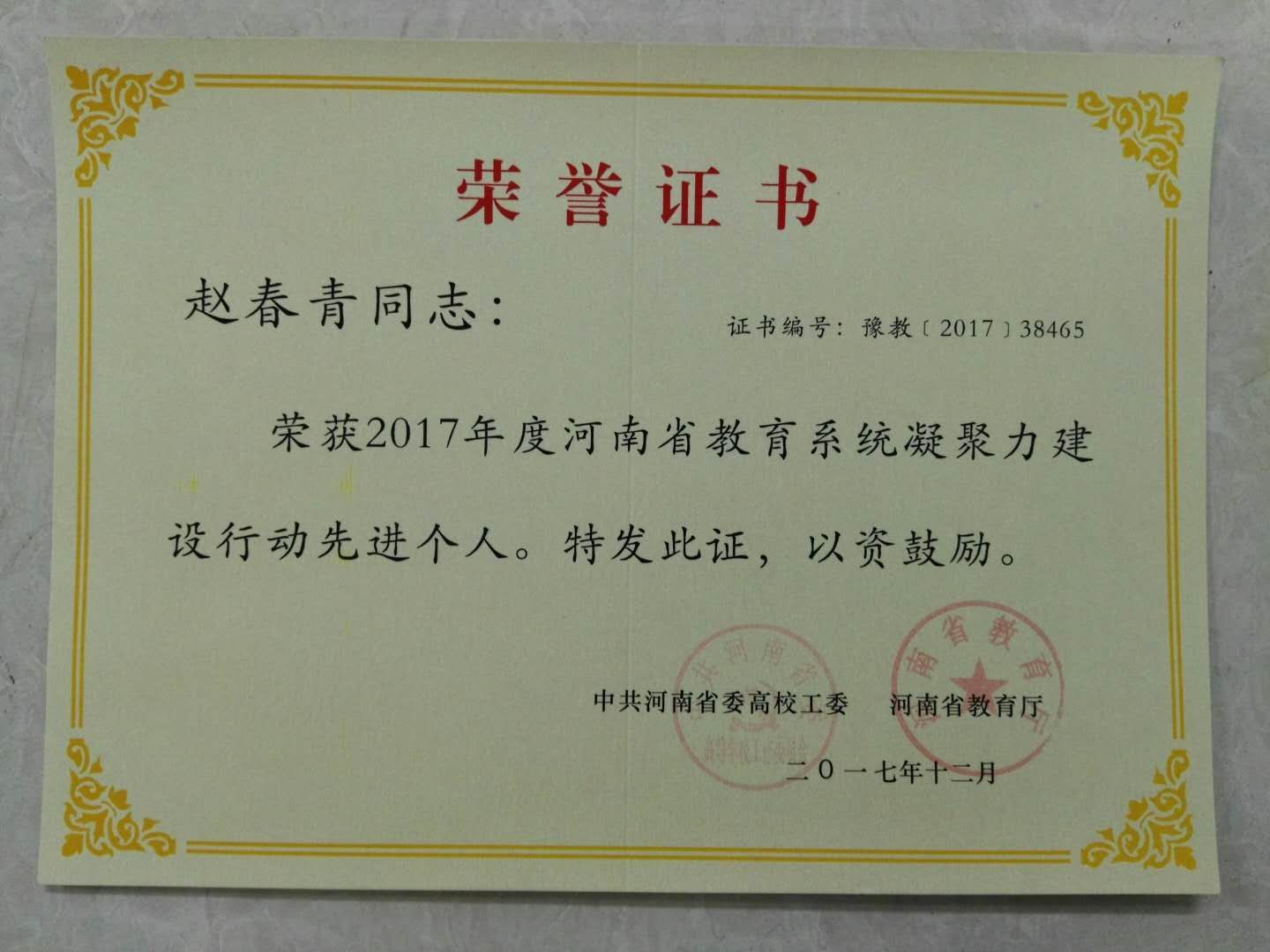 近日,中共河南省委高校工委、河南省教育廳下發(fā)文件,對(duì)全省教育系統(tǒng)凝聚力建設(shè)行動(dòng)先進(jìn)個(gè)人進(jìn)行表彰,由我校黨委宣傳統(tǒng)戰(zhàn)部推薦的信息工程學(xué)院副教授林鄧偉、經(jīng)濟(jì)管理學(xué)院副教授趙春青兩人榮獲“河南省教育系統(tǒng)凝聚力建設(shè)先進(jìn)個(gè)人”稱號(hào)。