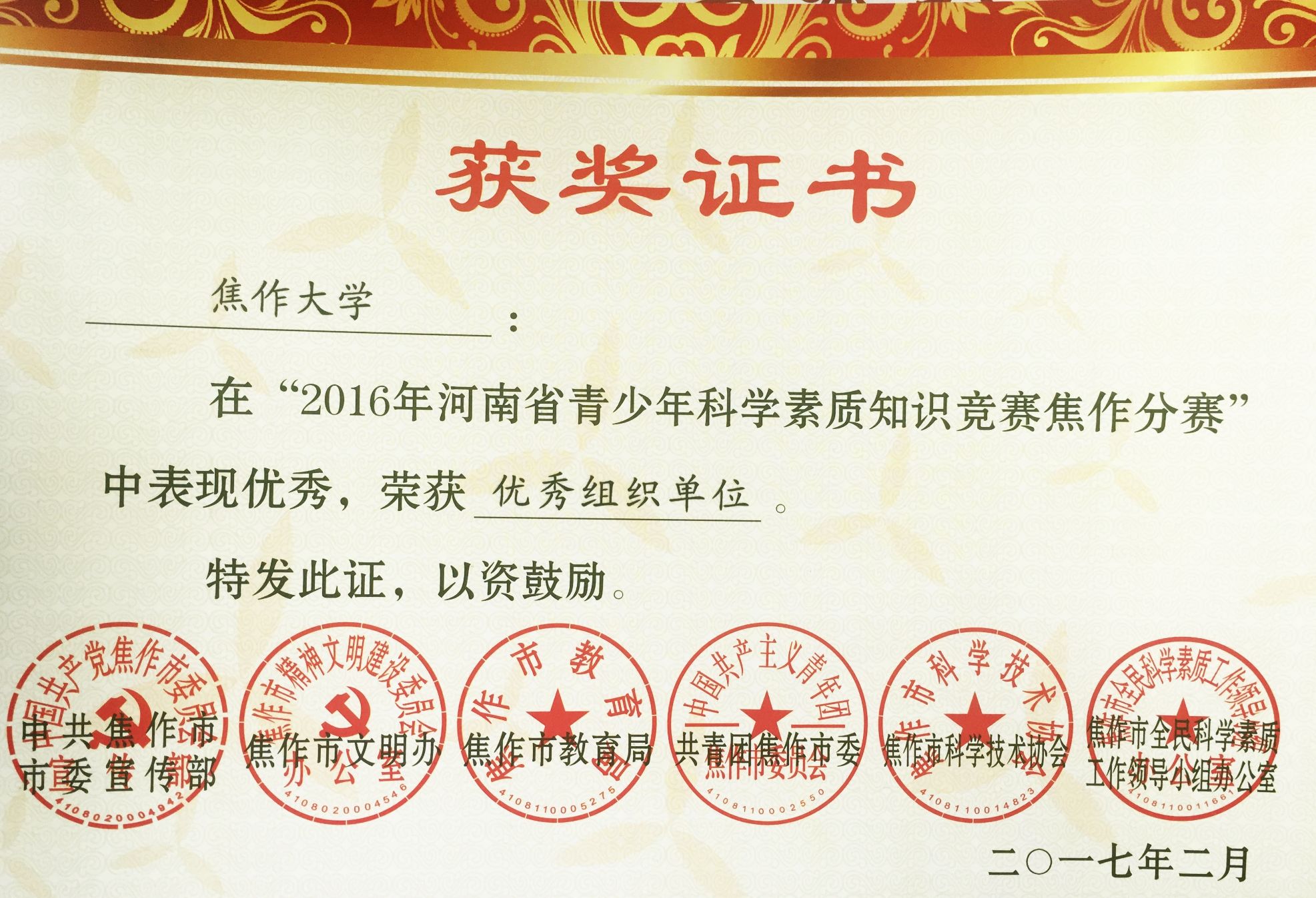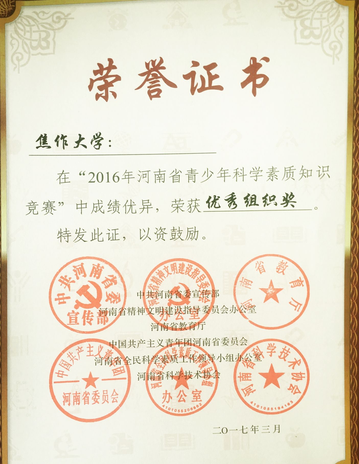 近日,我校榮獲2016年河南省青少年科學素質知識競賽“省級優秀組織獎”和“市級優秀組織獎”。河南省青少年科學素質網上知識競賽是由省委宣傳部、省文明辦、省教育廳、共青團河南省委、省素質辦、省科協主辦,本屆競賽以“走進創客、體驗創新”為主題,共有52.5萬名學生參與本次競賽。我校在得到競賽通知后積極組織各院系上網注冊答題,在全校范圍內掀起了“學科學、愛科學、講科學”的熱潮。