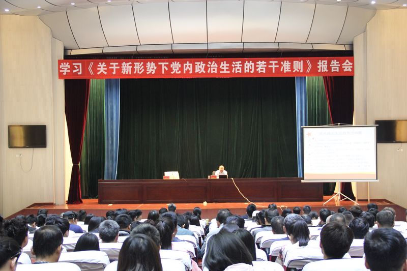 4月21日上午,我校舉辦學習《關于新形勢下黨內政治生活的若干準則》報告會,邀請紅色管理培訓知名專家簡振新教授為我校黨員干部及入黨積極分子作專題黨課輔導,并就當前中國軍事安全形勢進行解讀。校黨委書記魏曰高,副校長符德學、申文波,紀委書記張浦,副校長霍曉麗出席會議。校黨委副書記、副校長楊家卿主持會議。學校300余名黨員干部及入黨積極分子參加報告會。