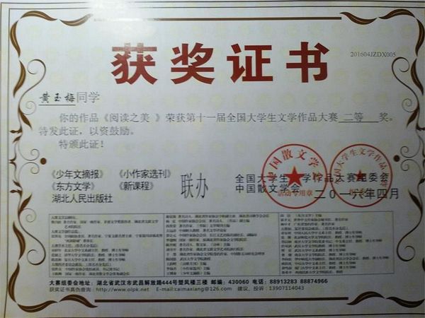近日,由中國散文學會、《少年文摘報》、《小作家選刊》、《東方文學》、《新課程》、湖北人民出版社等聯合舉辦的第十一屆全國大學生文學作品大賽結果揭曉,我校人文學院2015級學生黃玉梅、吳樂、汪圓圓、朱永恒的作品分別榮獲二等獎和三等獎。