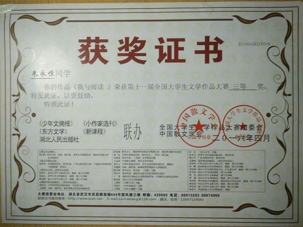 全國大學生文學作品大賽一年舉辦一次,是面向全國大學生的國家級文學賽事。人文學院在接到活動通知后,領導高度重視,在同學們中間進行了廣泛宣傳,組織同學們報名,鼓勵同學們積極投稿,最后擇優向大賽組委會投寄了11篇稿件。