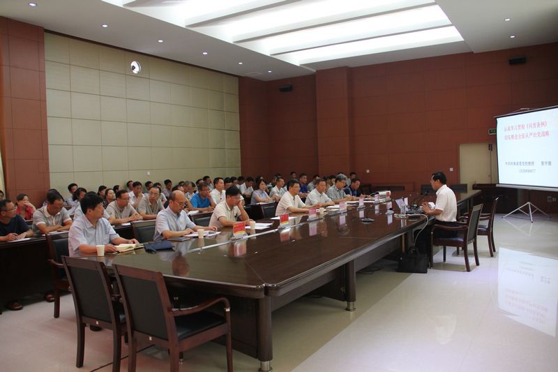 為將“兩學(xué)一做”學(xué)習(xí)教育引向深入,按照市委關(guān)于開展黨風(fēng)黨紀(jì)專項教育活動的統(tǒng)一部署,8月16日上午,學(xué)校在南校區(qū)行政樓學(xué)術(shù)報告廳舉辦黨風(fēng)黨紀(jì)專題教育報告會,邀請中共河南省委黨校原副校長、享受國務(wù)院特殊津貼專家郭學(xué)德教授作題為《認(rèn)真學(xué)習(xí)貫徹〈問責(zé)條例〉 扎實(shí)推進(jìn)全面從嚴(yán)治黨戰(zhàn)略》的報告。校領(lǐng)導(dǎo)魏曰高、鄭廣華、楊家卿、符德學(xué)、楊中漢、申文波、張浦,各黨總支書記、機(jī)關(guān)各黨支部書記,各職能部門負(fù)責(zé)人參加報告會。報告會由校黨委副書記、副校長楊家卿主持。