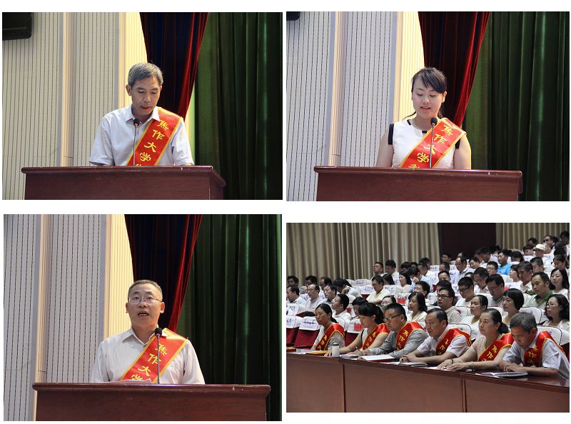 會上,副校長符德學宣讀《關于表彰2015-2016學年先進教師和先進教育工作者的決定》,工會主席楊中漢宣讀焦作市人力資源與社會保障局、焦作市教育局《關于表彰焦作市優秀教師、優秀教育工作者的決定》,副校長申文波同志宣讀《關于表彰2015-2016學年先進集體和先進標兵的決定》。受表彰的先進集體代表經濟管理學院院長盧國紅、教學標兵姜楠、科研標兵宋金柱分別發言。