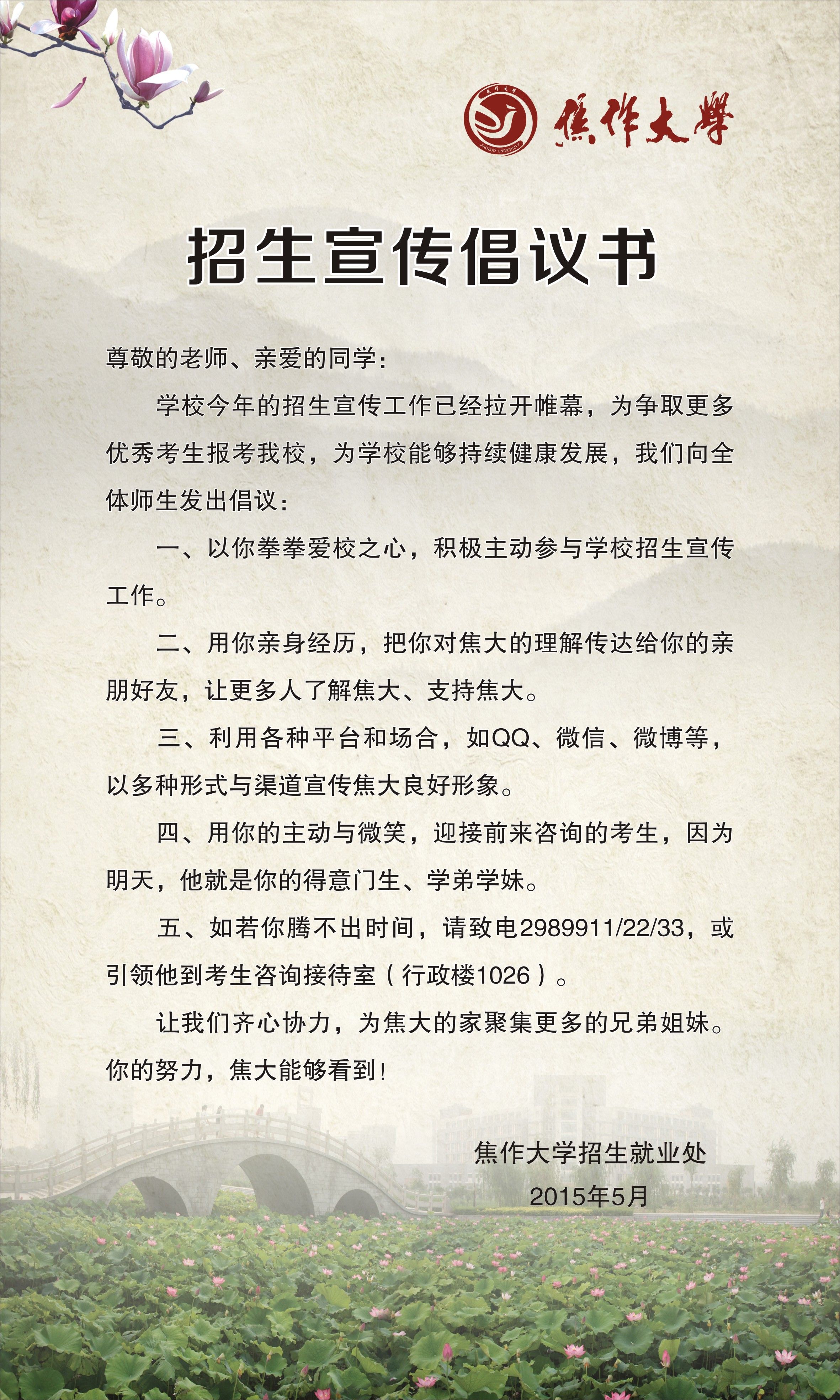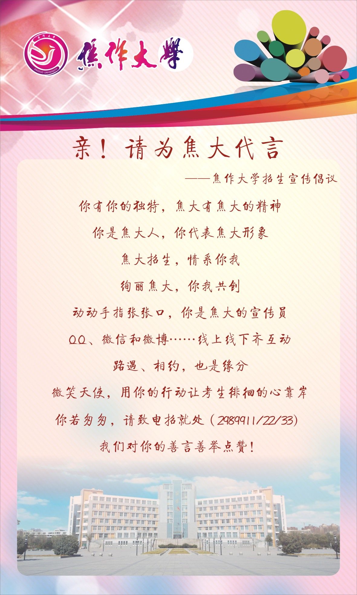地址:河南省焦作市人民路3066號 郵編:454000 招生咨詢電話:0391-2989911 2989922 2989933