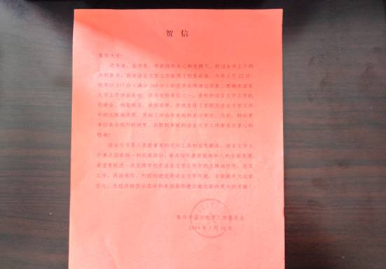 近日,焦作市語言文字工作委員會向我校在焦作市迎接《國家二類城市語言文字工作》評估驗收中的工作情況發(fā)信祝賀。
