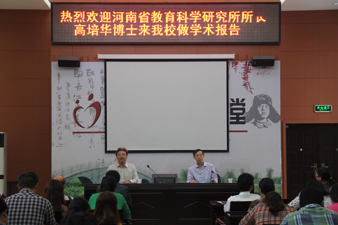 2013年9月25日下午,河南省教育科學研究所所長高培華博士學術報告會在新校區行政樓201報告廳舉行。黨委副書記焦金雷教授、副校長符德學博士等出席會議,會議由符校長主持,各系部教師參加了本次會議。