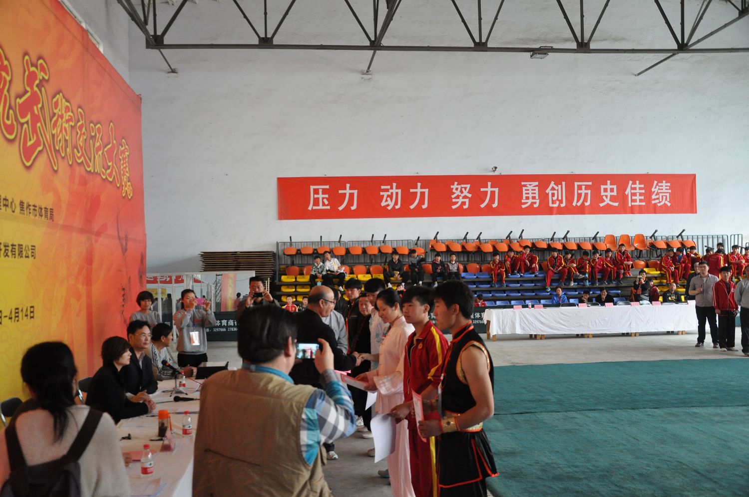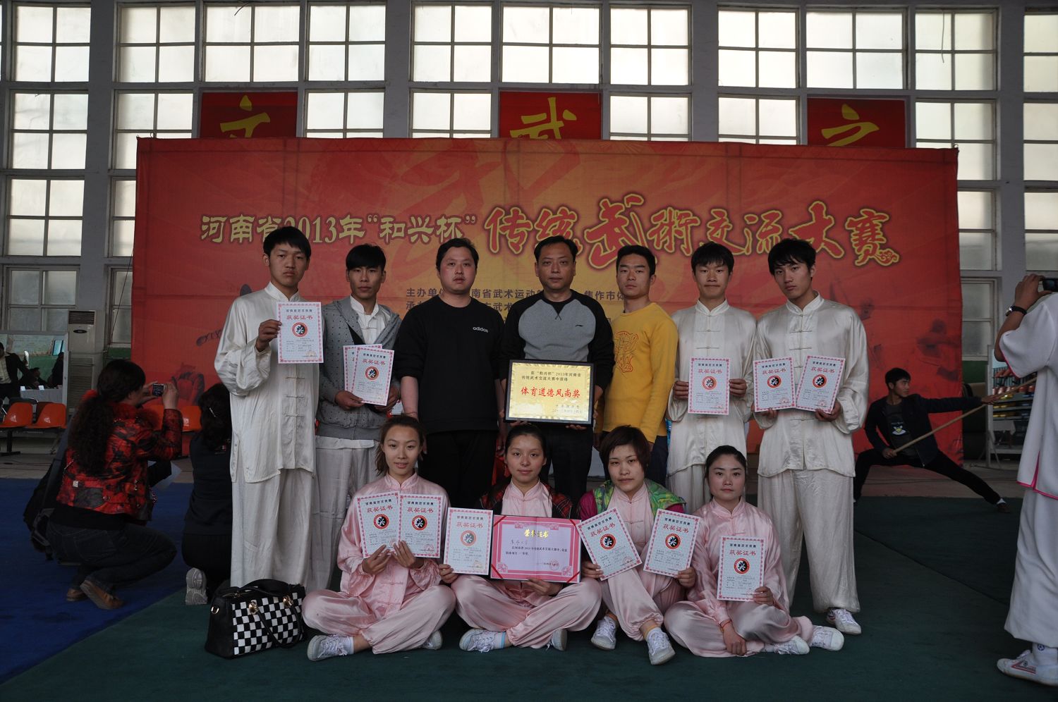 由河南省體育局主辦,河南省武術運動管理中心、河南省武術協會、焦作市體育局承辦的河南省傳統武術交流大賽于2013年4月11日—13日在焦作市武術館隆重舉行,本屆傳統武術交流大賽共有來自各省轄市、縣武術協會、武術之鄉、武術學校、武術團體等代表隊參加了本次比賽,我校共派出20名參賽人員(教練員和運動員)。在比賽中,我校代表隊技壓群雄、勇爭一流,經過兩天激烈的角逐,共有8人獲得了一等獎,11人獲得二等獎。其中獲得一等獎第一名的有6人;集體項目榮獲第一名。