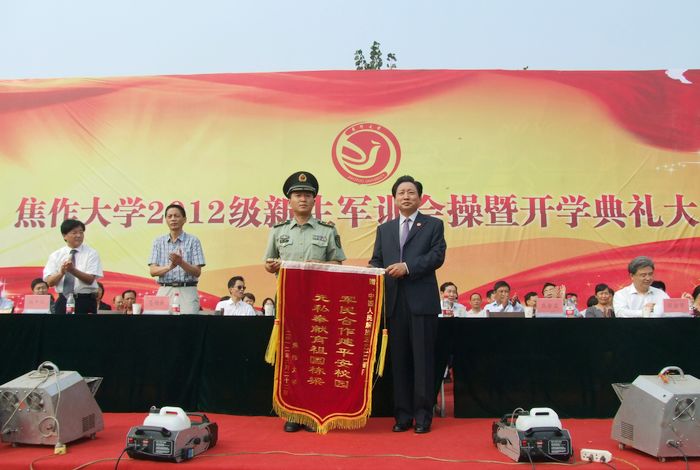 分列式結束后,袁基副團長對我校的軍訓成果給予了充分肯定,指出軍訓在大學生活的特殊意義,也對2012級新生提出了殷切希望。林校長代表全校師生向62111部隊贈送了錦旗,“軍民合作建平安校園 無私奉獻育祖國棟梁”,表達了對62111部隊的感謝。林校長對2012級新生作了三點要求:一、認知新環境,開啟新里程;二、明確新目標,激發內動力;三、做出新努力,實現新跨越。希望同學們三年奮斗,三年積累,三年收獲,將濃濃的愛國情懷轉化為報效祖國的不衰之志,將樸素的父母養育之恩轉化為報答之能,將焦大老師們付出的教育之愛將變成堅實的成才之果。林校長激情洋溢的講話使廣大新生深受鼓舞,讓同學們對未來的大學生活也有了更加明確的目標,講話過程中同學們不斷報以熱烈的掌聲。焦書記希望大家按軍隊領導及校長的講話要求,嚴格要求自己,發揚軍訓中不怕苦,不怕累的拼搏精神,勤奮學習,把握自己,遵守紀律,奮力攀登,努力完成學業。預祝2012級新生健康成長,前程輝煌。