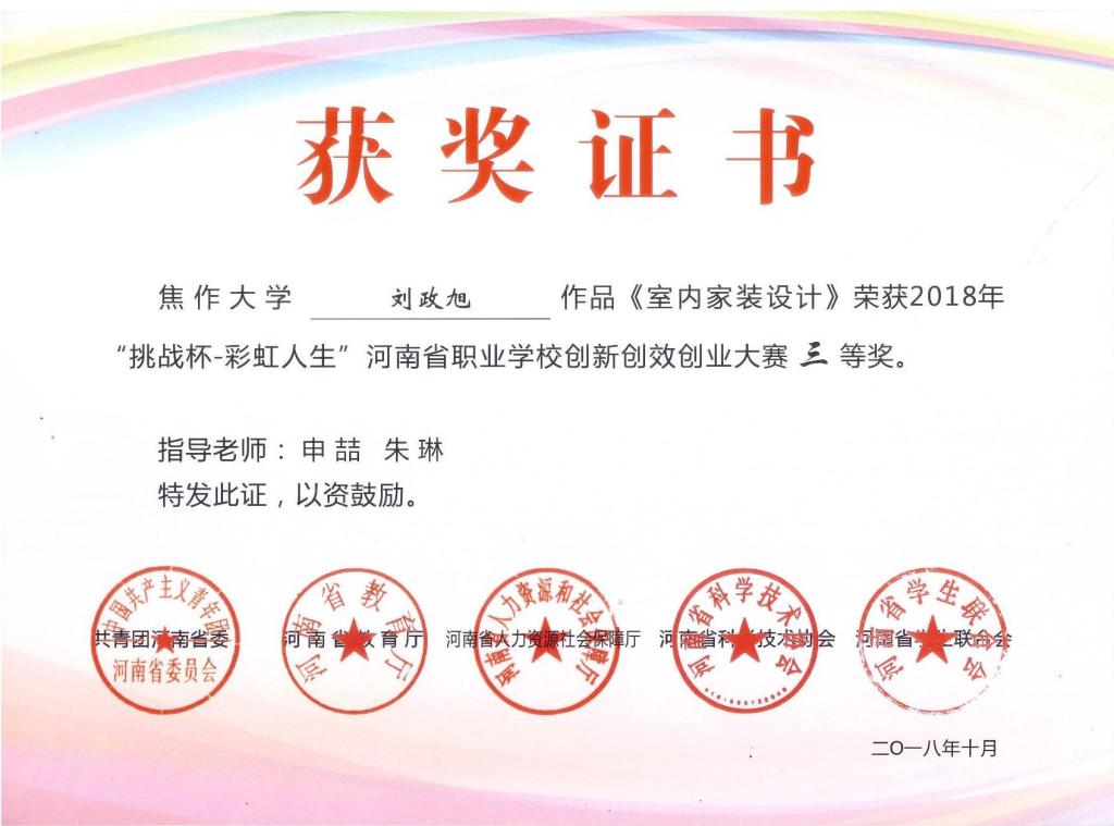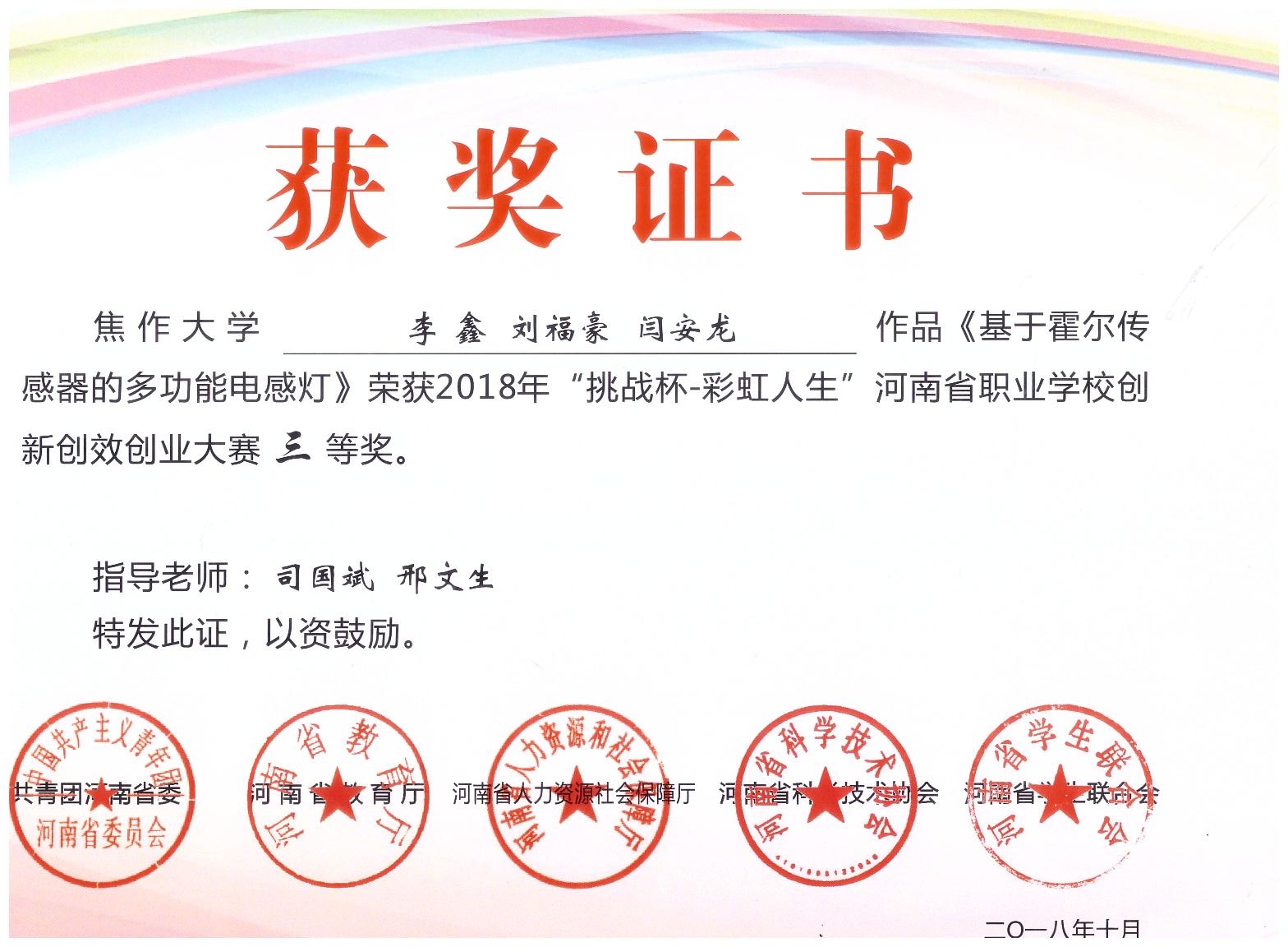 近日,由共青團河南省委、河南省教育廳、河南省人力和社會保障廳、河南省科學技術協會、河南省學生聯合會共同主辦的2018年“挑戰杯—彩虹人生”河南省職業學校創新創效創業大賽成績公布。我校由司國斌、邢文生老師指導,李鑫、劉富豪、閆安龍同學的作品《基于霍爾傳感器的多功能電感燈》,申喆、朱琳老師指導,劉政旭同學的作品《室內家裝設計》榮獲三等獎。