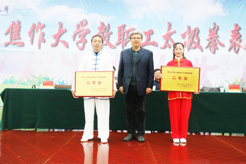 2019年4月22日下午,伴隨著溫暖的春風和綿綿的春雨,迎來了焦作大學第三屆教職工太極拳表演賽。校黨委書記魏曰高、黨委副書記、工會主席符德學、校紀委書記劉際平、副校長吳玉倫、副校長秦海金出席表演賽開幕式。黨委副書記、工會主席符德學致開幕詞,黨委書記魏曰高宣布焦作大學教職工第三屆太極拳表演賽開始。