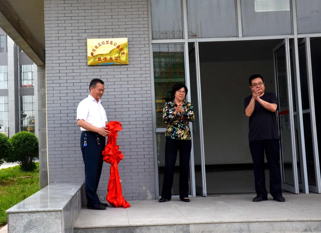 市禁毒委副主任、司法局副局長喬捍東和副校長霍曉麗為焦作大學“河南省高校禁毒公益聯盟”揭牌