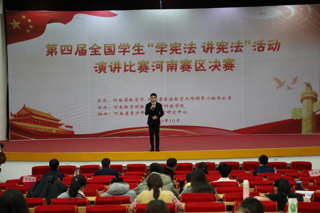10月26日—10月28日,第四屆全國學生“學憲法 講憲法”活動河南賽區決賽在黃河科技學院舉行,我校人文學院播音與主持專業何錦華同學在姜楠老師的指導下榮獲高校組演講比賽的一等獎。
