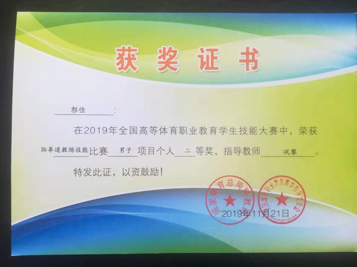 我校派出了由太極武術學院鞏攀、王勇、王友軍為指導教師,太極武術學院周榮欣、郭嘉、馬路營、陳嘉興4名學生為隊員的代表團參加了本次比賽。在本屆大賽中,我校參賽選手全力以赴、頑強拼搏。面對來自全國18所省級體育職業學院的參賽強手(絕大多數選手為省隊隊員),不畏懼、不退縮,展示出了自身的職業素質和技能水平,并與其他學校深入交流學習,共同提高。經過個人技能、教學輔導以及項目推介三項比拼,我校參賽四名隊員共獲得1個二等獎和3個三等獎的好成績,并榮獲體育道德風尚獎。學校、學院領導高度重視本次大賽,在隊伍選拔、校內訓練及比賽過程,都給予了關注和鼓勵。學生們通過比賽增長了見識,收獲了友誼,看到了成績,發現了不足,對今后的學習發展充滿了自信和信心,指導老師們通過比賽,開拓了視野,打開了思路,增長了教學心得,為今后的教學和訓練積累了豐厚的經驗。