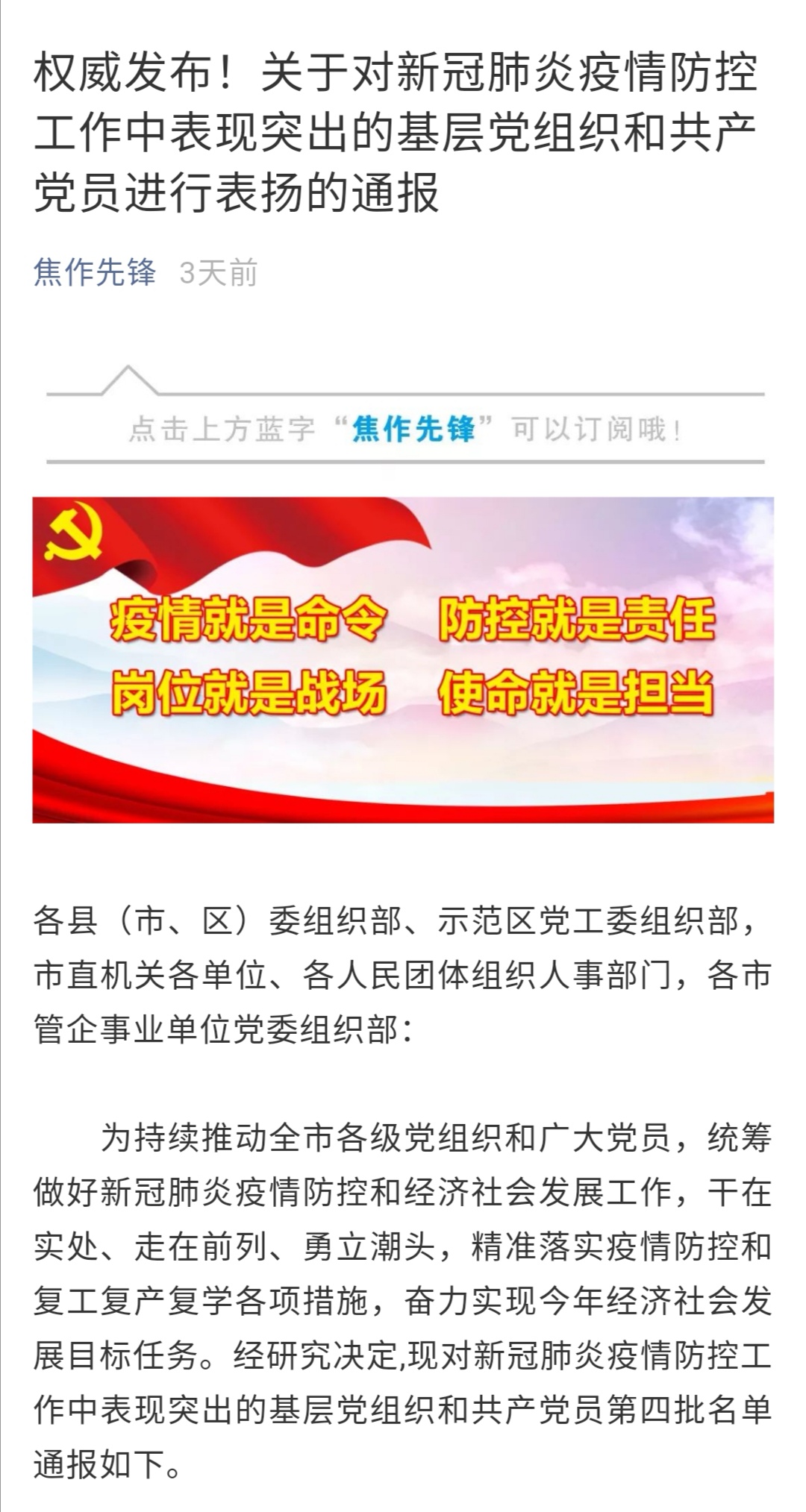 4月27日,焦作市委組織部通過“焦作先鋒”微信平臺,對在新冠肺炎疫情防控工作中表現突出的基層黨組織和共產黨員進行了通報表揚。其中,我校學生處處長張永強被評為在新冠肺炎疫情防控工作中表現突出共產黨員。