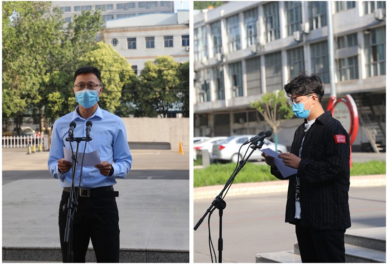 升旗儀式之后,太極武術(shù)學(xué)院教師、河南省五一勞動(dòng)獎(jiǎng)?wù)芦@得者郭巍,太極武術(shù)學(xué)院的學(xué)生分別代表師生發(fā)言,表達(dá)了把災(zāi)難當(dāng)教材與祖國共成長的真摯情感。