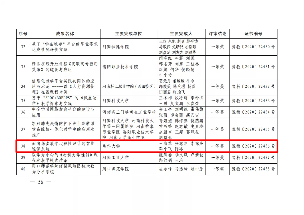 近日,河南省教育廳下發了《關于公布2020年度河南省教育信息化優秀成果獎獲獎名單的通知》(教科技〔2020〕332號),對2020年度河南省教育信息化優秀成果獎獲獎名單予以公布,我校多位教師論文及作品獲獎。其中,理論研究類成果(論文類)獲得一等獎三個、二等獎兩個;創新應用類成果(高等院校及職業院校)一等獎一個,二等獎三個;優秀教育電視節目類,校園電視作品二等獎三個。獲獎名單如下: