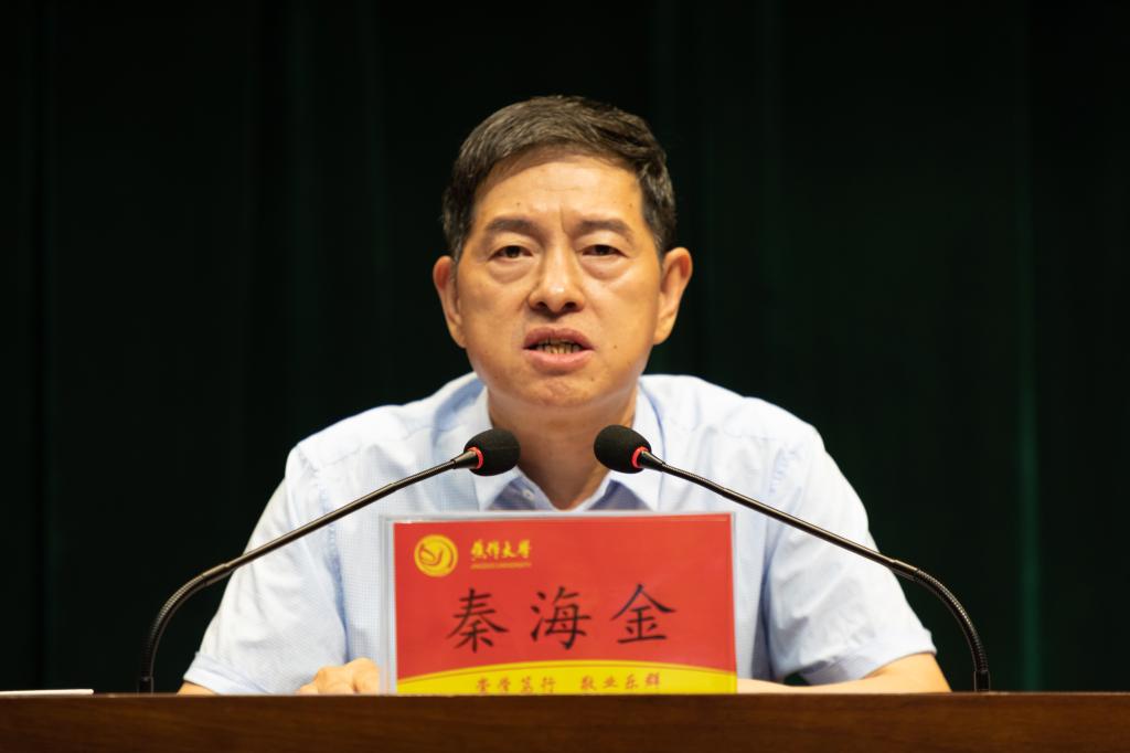 秦海金代表全校師生對(duì)培訓(xùn)班的如期開(kāi)班表示熱烈祝賀!對(duì)培訓(xùn)班學(xué)員的到來(lái)表示熱烈的歡迎!并對(duì)參與籌備此次培訓(xùn)工作付出心血汗水的有關(guān)領(lǐng)導(dǎo)和同志們表示衷心感謝!他提出四點(diǎn)意見(jiàn):第一,學(xué)員們要提高認(rèn)識(shí)、轉(zhuǎn)變角色,增強(qiáng)學(xué)習(xí)的使命感和責(zé)任感;第二,學(xué)員們更要靜心定遠(yuǎn)、虛心求教,增強(qiáng)學(xué)習(xí)的主動(dòng)性和自覺(jué)性;第三,參加培訓(xùn)的各位學(xué)員都是省級(jí)以上名師,希望大家更要嚴(yán)于律己、為人師表,增強(qiáng)學(xué)習(xí)的規(guī)范性和實(shí)效性;第四,各職能部門(mén)要凝心聚力、全力以赴,增強(qiáng)服務(wù)的人性化和感情化,保證在按時(shí)按質(zhì)按量完成這期培訓(xùn)班任務(wù)的基礎(chǔ)上,將培訓(xùn)做出品牌和特色,做好這項(xiàng)“國(guó)”字號(hào)工程。