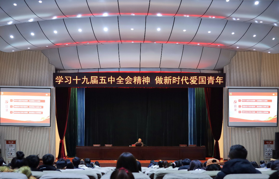 2020年12月11日下午,校黨委副書記、校長鄭廣華以《學習十九屆五中全會精神 做新時代愛國青年》為題,為我校師生上了一堂生動的愛國主義思政課。學生處全體成員、各學院分管學生工作負責人、全體輔導員、優秀學生干部代表等一百余人參加學習。