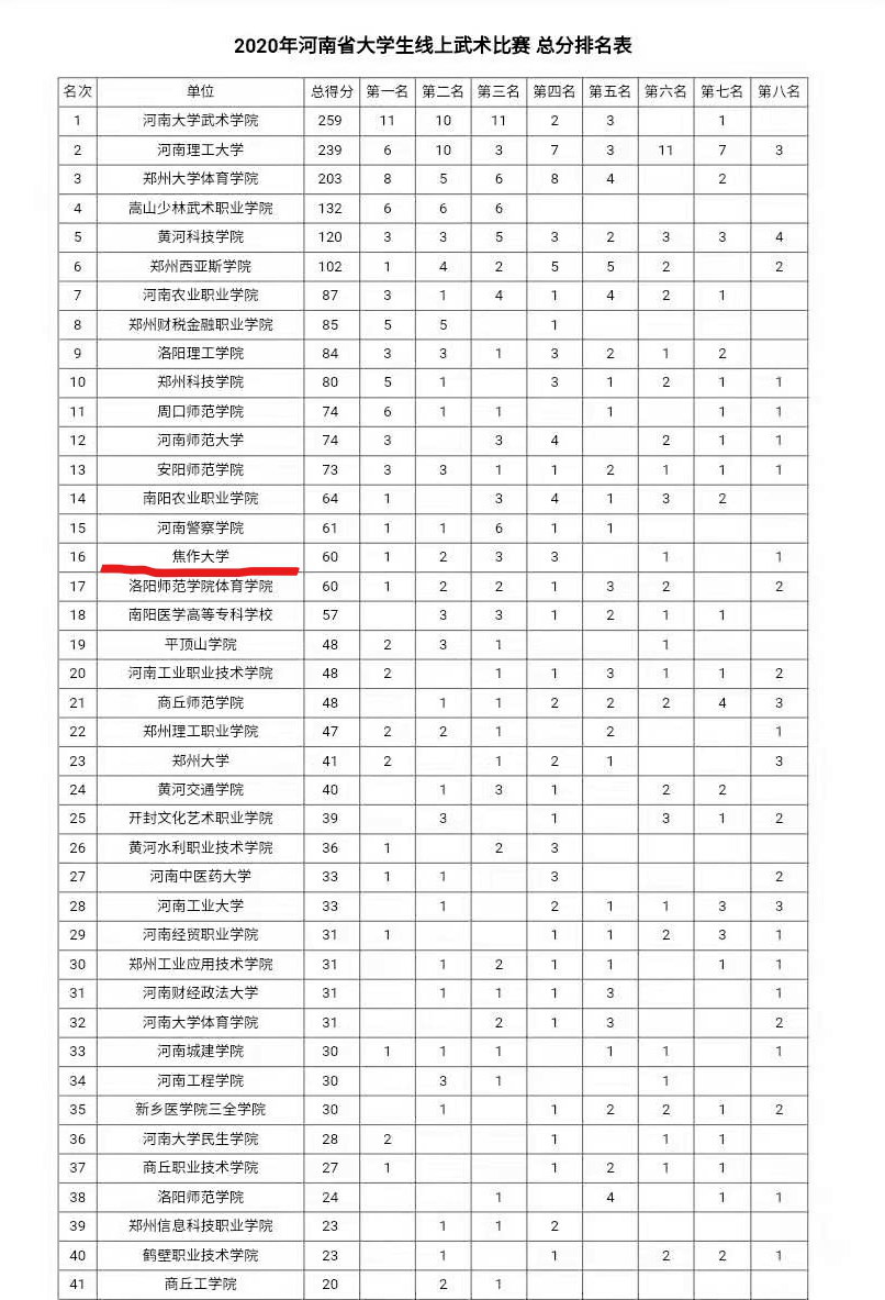 近日,我校太極武術學院在“2020年河南省大學生線上武術比賽”中獲得佳績。本次比賽共有全省57所高校參加,我校男子、女子代表隊分別獲得乙組團體總分第2名、第3名,太極球集體項目獲得一等獎。