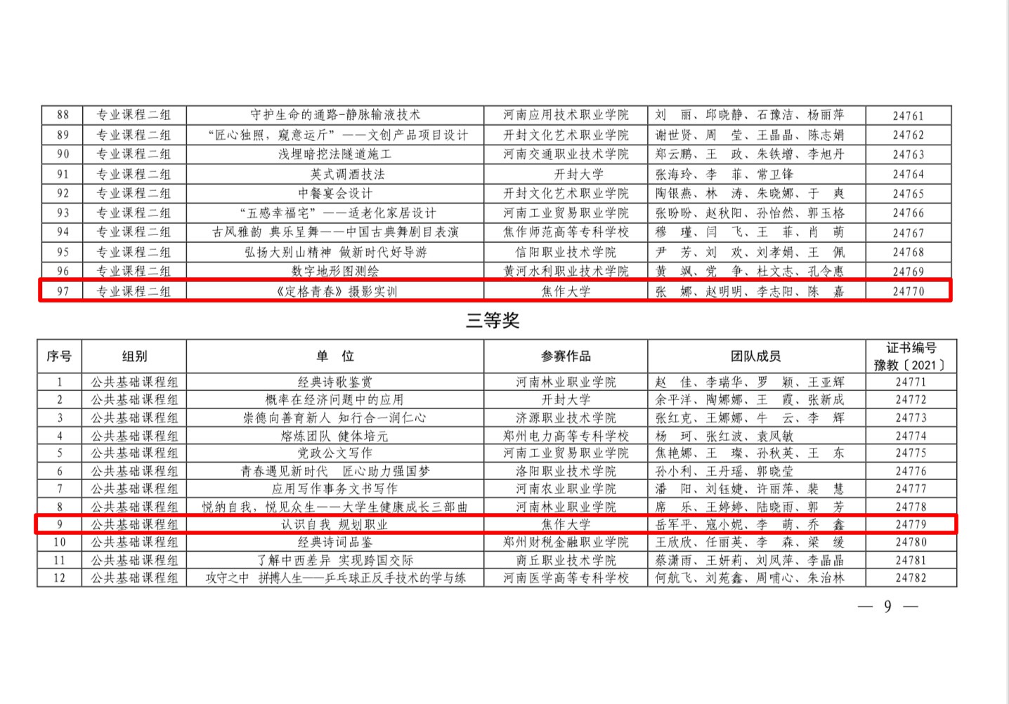 根據河南省教育廳辦公室《關于開展2021年河南省高等職業教育教學競賽活動的通知》(教辦職成〔2021〕91號)和我校《焦作大學2021年度教師教學能力比賽活動方案》(教務處〔2021〕45號)《關于焦作大學2021年度教師教學能力比賽校級決賽的通知》(教務處〔2021〕51號),經教師自主申報、院級初賽、校級專家評審和現場比賽、上報省級網絡評審、省級現場決賽等多個環節的積極準備,我校參與2021年河南省高等職業教育教學能力大賽的6支團隊再創佳績,三個組別共6項作品均獲獎,其中二等獎3項,三等獎3項。