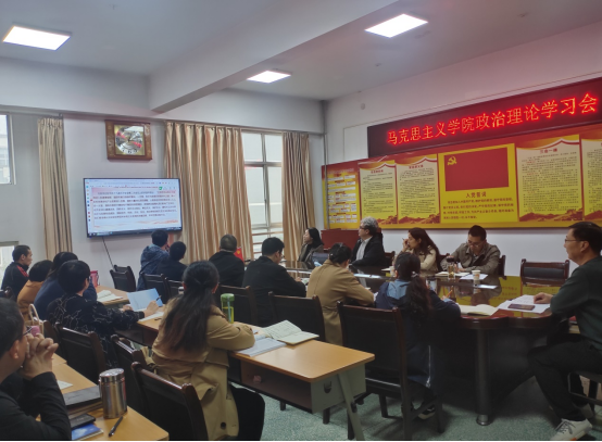 與會人員首先集體收看了教育部主辦的《周末理論大講堂》---《對“新發展階段、新發展理念、新發展格局”的學習、認識、理解和思考》。講座后,形勢與政策教研室教師結合課程講授內容和講座內容,談了自己的認識和體會。學院領導班子成員、思政課骨干教師還圍繞《關于加強新時代馬克思主義學院建設意見》、《關于加快構建思想政治工作體系的意見》、《高等學校課程思政建設指導綱要》等重要文件精神進行了再學習,并就各自學習體會及今后工作思路,以及“如何上好思政課”分別進了研討交流。
