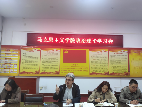 符德學指出,馬克思主義學院政治理論學習會準備充分、主題鮮明、交流廣泛、很有特色,很有深度。就今后工作,符德學提出三點具體要求:一是繼續加強政治理論學習,學習習近平新時代中國特色社會主義思想,要做到真學、真懂、真會,入腦入心,走深走實。二是一定要理論聯系實際,把原理與實際結合起來,用原理闡釋中國社會的發展和進步,講好中國故事。三是上下要齊心協力,建好馬克思主義學院,促進馬克思主義學院內涵式發展,將馬院建成學校的名牌學院,提高馬院的社會影響力。