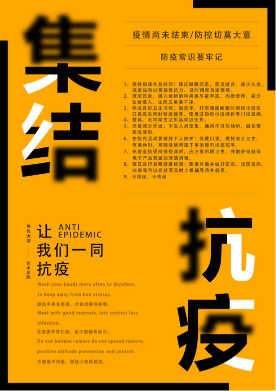 此次海報作品由藝術學院師生共同創作。師生用專業技能凝聚青春力量,用無聲作品傳遞防疫理念,借助藝術創意的宣傳優勢,助力打贏疫情防控戰役,堅定信心、同舟共濟!