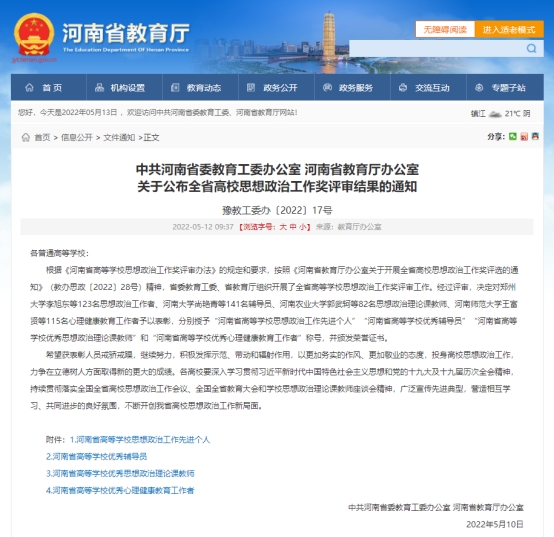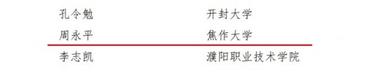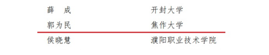 近日,全省高校思想政治工作獎(jiǎng)評(píng)審結(jié)果名單公布。我校4名教師獲得表彰。其中,劉文莉獲得“河南省高等學(xué)校思想政治工作先進(jìn)個(gè)人”稱號(hào);郭為民獲得“河南省高等學(xué)校優(yōu)秀輔導(dǎo)員”稱號(hào);張喜云獲得“河南省高等學(xué)校優(yōu)秀思想政治理論課教師”稱號(hào);周永平獲得“河南省高等學(xué)校優(yōu)秀心理健康教育工作者”稱號(hào)。