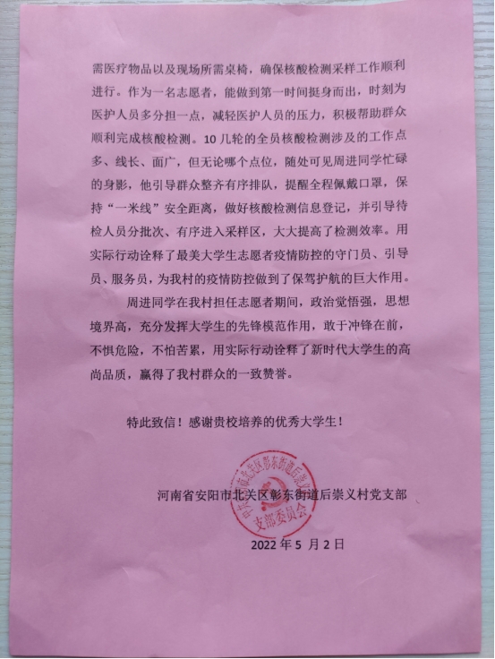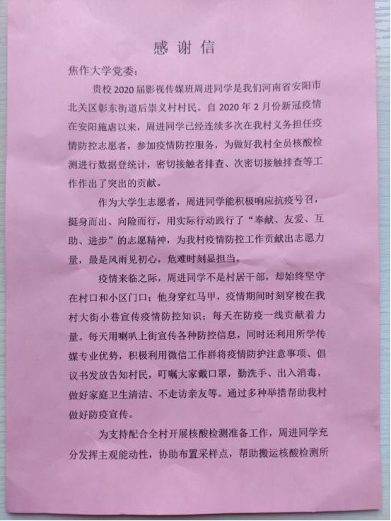 近日,我校收到安陽市北關區彰東街道后崇義村寄來的感謝信。信中對我校2020級影視傳媒班周進同學在家鄉防疫工作中所做的貢獻表示感謝。