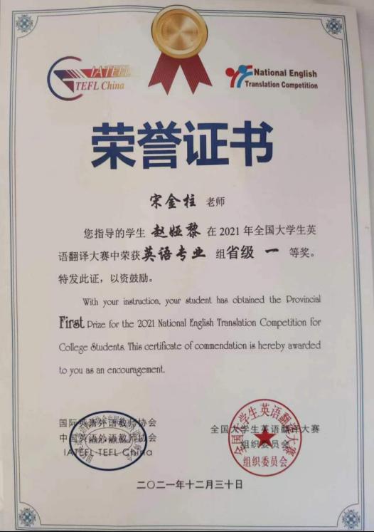 在2021年全國大學生英語翻譯大賽中,基礎教學部2020級商務英語專業學生趙婭黎在我校宋金柱老師的輔導下,榮獲了省級一等獎的好成績。