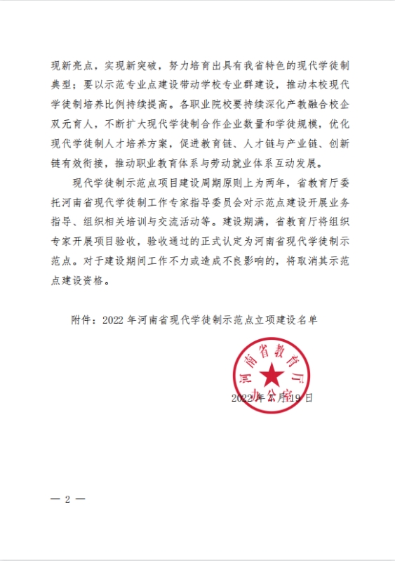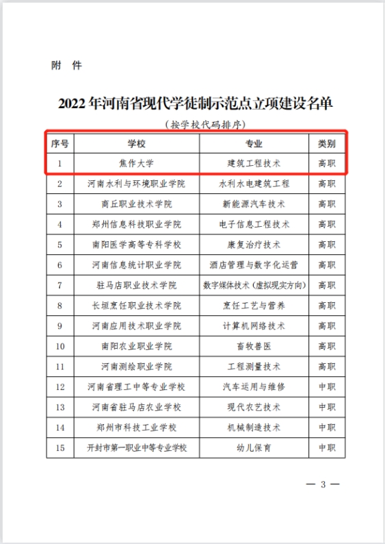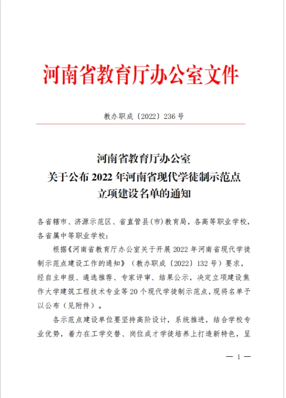 近日,河南省教育廳發布《關于公布2022年河南省現代學徒制示范點立項建設名單的通知》(教辦職成〔2022〕236號),我校土木建筑工程學院建筑工程技術專業被認定為河南省現代學徒制示范點立項建設項目。