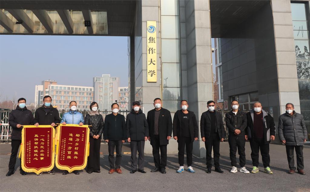 2022年12月7日上午,沁陽市王曲鄉北孔村黨支部書記梁長寶帶領村兩委、狼牙山五壯士之一宋學義烈士后代、黨員群眾和脫貧戶代表一行十余人來到焦作大學,為學校贈送錦旗。校黨委書記汪詩懷、黨委組織部部長李文靜、駐村工作隊隊長楊忻和駐村第一書記田慶偉參加錦旗授予儀式。