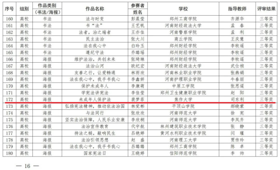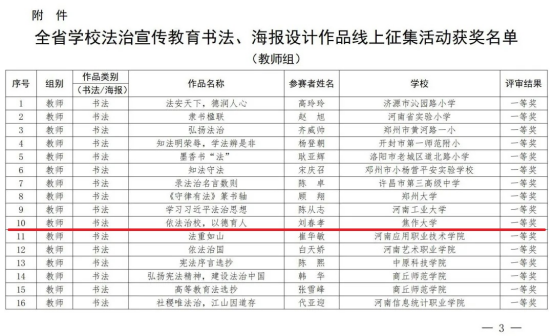 近日,根據《河南省教育廳辦公室關于公布全省學校法治宣傳教育書法、海報設計作品線上征集活動獲獎名單的通知》,我校遠程教育學院劉春孝老師書法作品榮獲教師組一等獎,藝術學院裴夢菲同學海報作品榮獲學生組三等獎。