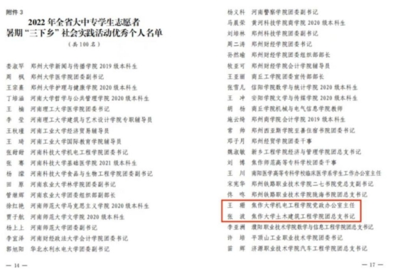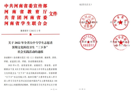 近日,由省委宣傳部、省教育廳、團省委、省學聯聯合下發了《關于2022年全省大中專學生志愿者暑期文化科技衛生“三下鄉”社會實踐活動的通報》(豫青聯字〔2023〕2號),我校榮獲“優秀單位”,化工與環境工程學院“守衛藍天凈土,助力鄉村振興”實踐團、藝術學院“志愿無止盡,星火永傳承”社會實踐服務團榮獲“優秀團隊”,機電工程學院黨政辦公室主任王珊、土木建筑工程學院團總支書記張波榮獲“優秀個人”,校團委“青”心聚力,基層有我——“返家鄉”社會實踐項目榮獲“優秀品牌項目”榮譽稱號。