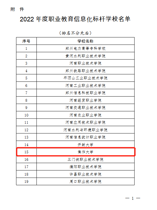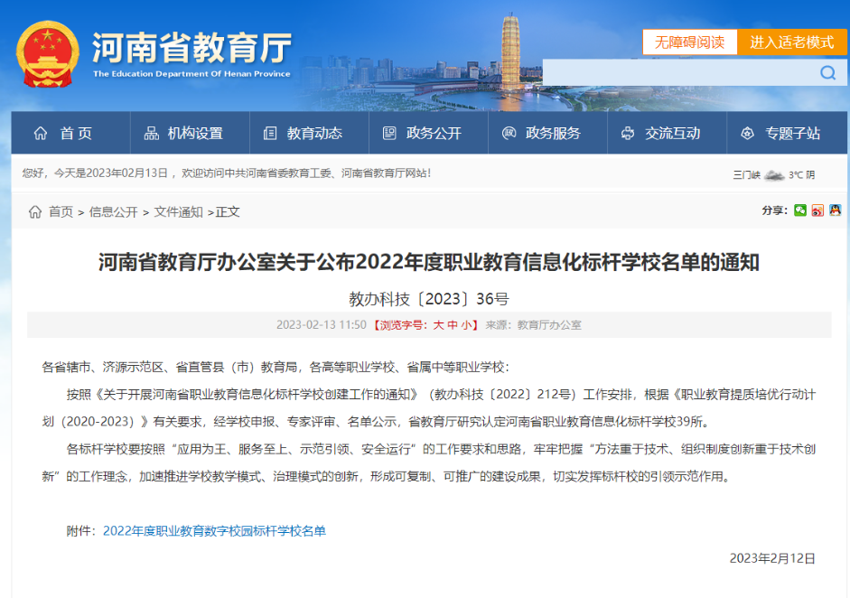 近日河南省教育廳下發(fā)了《河南省教育廳辦公室關(guān)于公布2022年度職業(yè)教育信息化標桿學校名單的通知》(教辦科技〔2023〕36號),我校成功入選河南省職業(yè)教育信息化標桿學校。