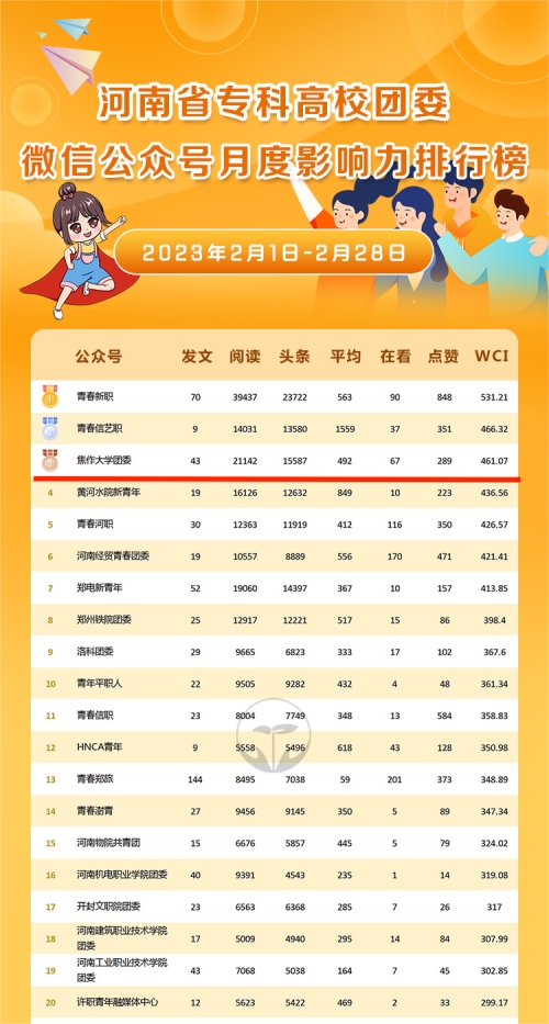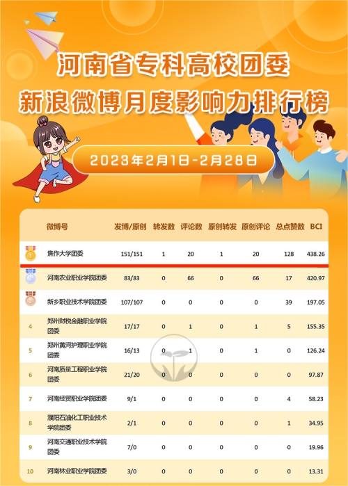 3月11日,河南省教育廳微信公眾號《豫教思語》對全省高校團委2月份新媒體影響力進行排名,焦作大學團委新浪微博榮獲全省專科第一名,焦作大學團委微信公眾號榮獲全省??频谌?。