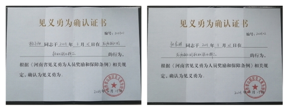 4月13日,山陽區見義勇為協會組織召開評定委員會,對楊子旭和張家瑄行為進行認定。經現場一致表決,認為楊子旭和張家瑄的行為符合《河南省見義勇為人員獎勵和保障條例》,為弘揚正能量,表彰見義勇為行為,決定為兩人發放見義勇為確認證書及每人2000元獎勵金。
