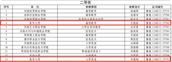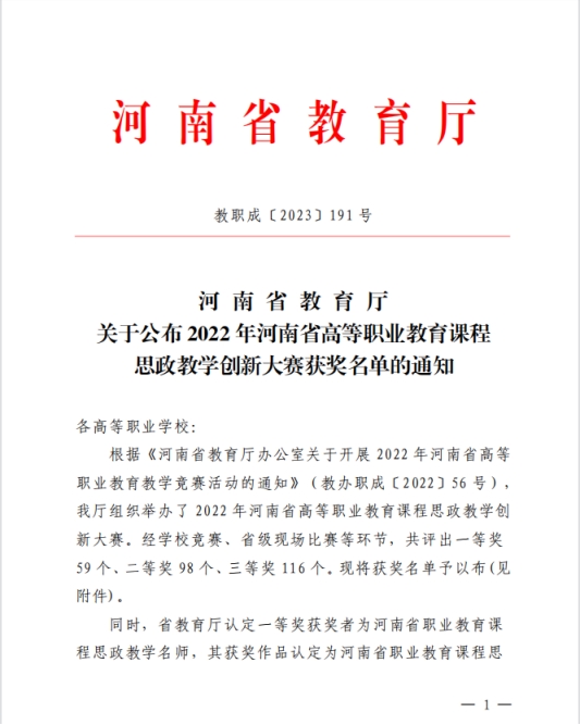 2023年4月,河南省教育廳舉行2022年河南省高等職業教育課程思政教學創新大賽,我校參賽教師喜獲一等獎2項,二等獎2項,三等獎1項。