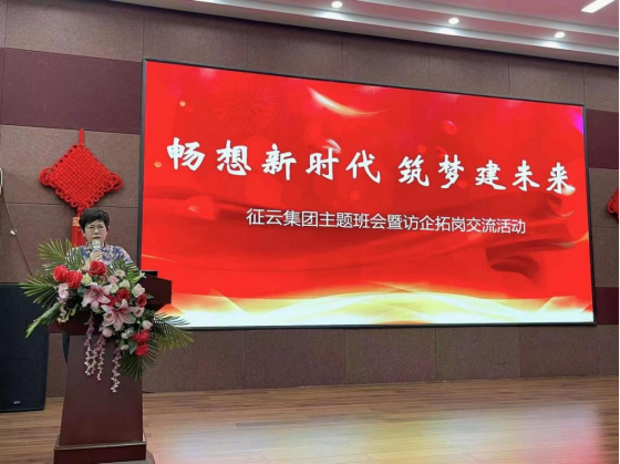 霍曉麗一行與征云集團領導就“雙元制”人才培養模式在公司建筑施工、技術開發等方面發揮作用情況進行了探討,隨后參觀了集團榮譽室,走訪了政協之家,并在集團大禮堂舉行了以“暢想新時代、筑夢見未來”為主題的雙元制班主題班會。