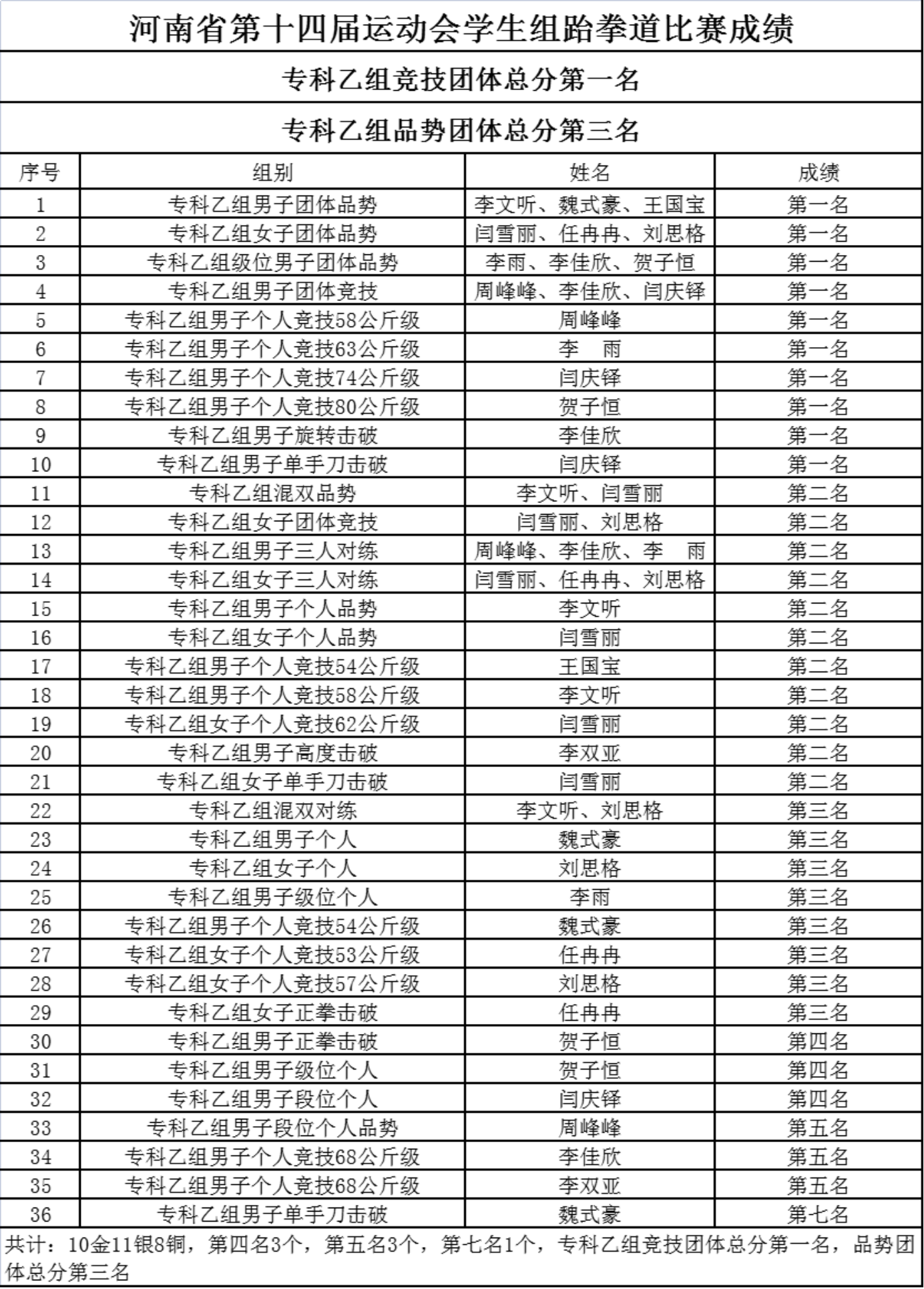 我校共派出12名跆拳道運動員參加了本次比賽,共斬獲29枚獎牌,其中金牌10枚、銀牌11枚、銅牌8枚,同時獲得專科乙組競技團體總分第一名、專科乙組品勢團體總分第三名。