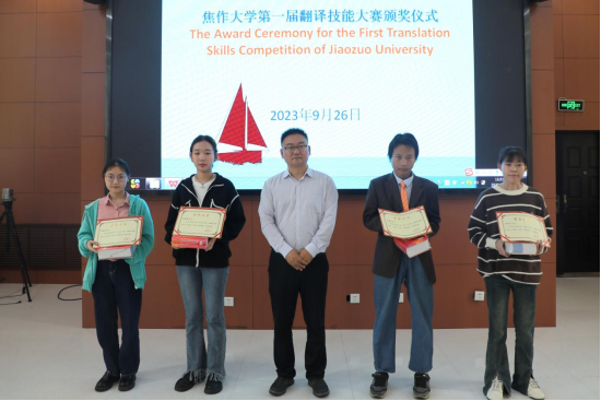 9月26日下午,頒獎(jiǎng)儀式在行政樓201會(huì)議室舉行。副校長(zhǎng)林鄧偉教授、基礎(chǔ)教學(xué)部主任豐樹(shù)謙教授、質(zhì)量管理與發(fā)展規(guī)劃處邢樹(shù)強(qiáng)教授和教務(wù)處、基礎(chǔ)教學(xué)部的老師為獲獎(jiǎng)選手頒發(fā)了證書(shū)和獎(jiǎng)品。林鄧偉對(duì)本次翻譯技能大賽的成功舉辦表示熱烈祝賀,鼓勵(lì)廣大學(xué)子不斷提高翻譯實(shí)踐能力,在今后的學(xué)習(xí)中再接再厲,取得更大的進(jìn)步。