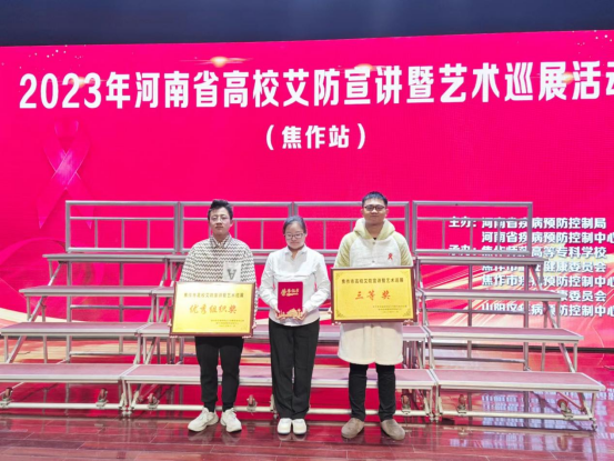 11月26日上午,2023年焦作市高校艾防宣講暨藝術巡展活動在焦作師專舉辦。我校黨委委員、副校長劉際平,宣傳統戰部部長張繼文出席活動,并給獲獎選手頒獎。我校獲得優秀組織獎,參與展演的小品《讓青春不后悔》和歌曲《擁抱你》獲得三等獎。由焦作大學紅絲帶志愿者協會參與拍攝的防艾宣傳片在活動現場和媒體平臺循環展播。