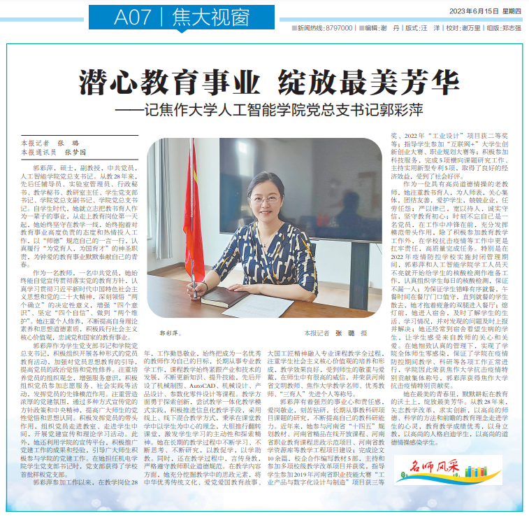 近日,焦作日報對我校人工智能學院黨總支書記郭彩萍先進事跡進行報道。
