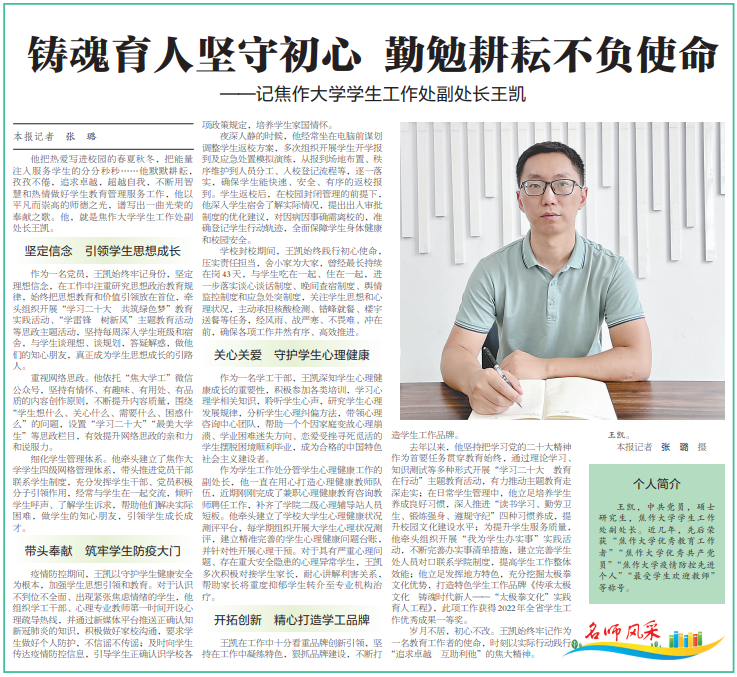 近日,焦作日報對我校學(xué)生工作處副處長王凱先進事跡進行報道。