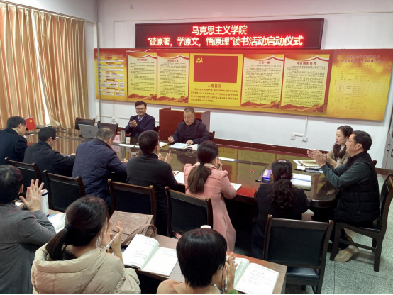 為認真貫徹落實好習近平總書記對思政課教師提出“六要”的基本要求,提升思政課教師理論底蘊,促進思政課課堂教學質量提高,2021年11月19日下午,馬克思主義學院“讀原著、學原文、悟原理”讀書活動啟動儀式在學院會議室舉行。啟動儀式后,學院首場讀書活動特邀請河南理工大學馬克思主義學院教授、碩士生導師張富文博士做了《<實踐論>生成邏輯、文本體系、相關問題及當代價值---<實踐論>導讀》專題報告,為老師的讀原著活動做出指導。活動由馬克思主義學院院長李世偉主持,學院全體教師參加。