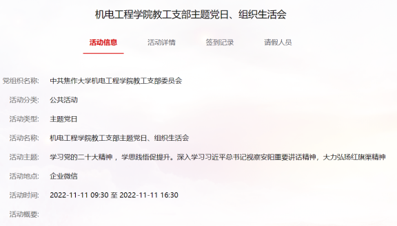 為認(rèn)真落實(shí)《關(guān)于以“深入學(xué)習(xí)習(xí)近平總書記視察安陽重要講話精神,大力弘揚(yáng)紅旗渠精神”為主題召開專題組織生活會(huì)的通知》精神,2022年11月11日上午,機(jī)電工程學(xué)院教工黨支部和學(xué)生黨支部通過線下線上相結(jié)合的方式組織召開了專題組織生活會(huì)。