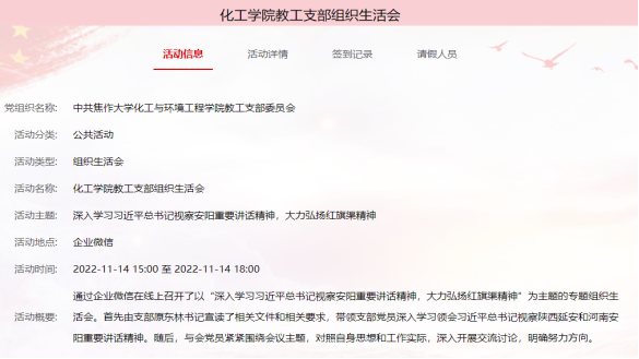 為深入學(xué)習(xí)貫徹黨的二十大精神和習(xí)近平總書記視察河南安陽重要講話精神,深刻領(lǐng)會(huì)紅旗渠精神的豐富內(nèi)涵和時(shí)代價(jià)值,按有關(guān)要求,化工與環(huán)境工程學(xué)院教工黨支部和學(xué)生黨支部分別于2022年11月14日下午以線下線上相結(jié)合的方式組織召開了“深入學(xué)習(xí)習(xí)近平總書記視察安陽重要講話精神,大力弘揚(yáng)紅旗渠精神”專題組織生活會(huì)。院黨總支書記田京城,院長蘇永祥,院黨總支副書記歐陽勝,副院長王永軍及副院長原東林以普通黨員身份參加了所在黨支部的專題組織生活會(huì)。